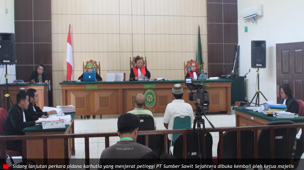 Sidang ke-13 – Agenda Pemeriksaan Terdakwa PN Pelalawan, Selasa 3 Maret 2020—Majelis Hakim Bambang Setyawan, Nur Rahmi dan Ria Ayu Rosalin memeriksa terdakwa PT Sumber Sawit Sejahtera (SSS) yang diwakili Direktur Utama Eben Ezer Djadiman Halomoan Lingga dan Pjs Estate Manager Awli...