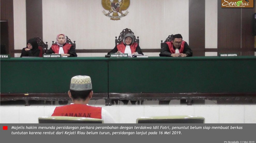 Bangkinang, 13 Mei 2019—Majelis hakim pengadilan Negeri Bangkinang membuka persidangan perkara perambahan kawasan hutan dengan terdakwa Idil Fitri, agenda sidang kali ini penuntut umum akan membacakan berkas tuntutan terhadap Idil Fitri.