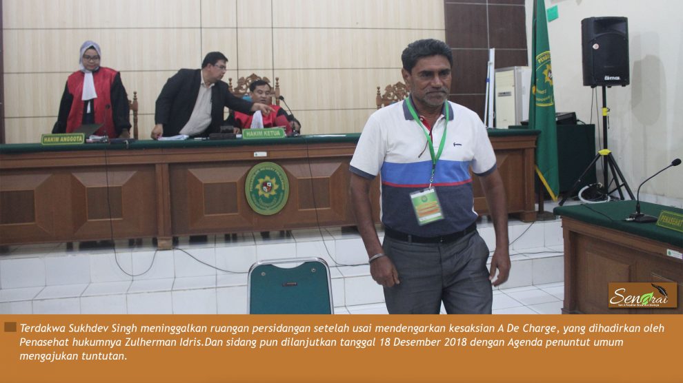 PN Pelalawan, 5 Desember 2018 – Pukul 13.25, sidang kembali di gelar dipimpin Majelis Hakim Ketua Nelson Angkat dengan Terdakwa Sukhdev Singh dengan agenda pemeriksaan terdakwa. Terdakwa didampingi Penasehat Hukum Zulherman Idris tanpa rekan.