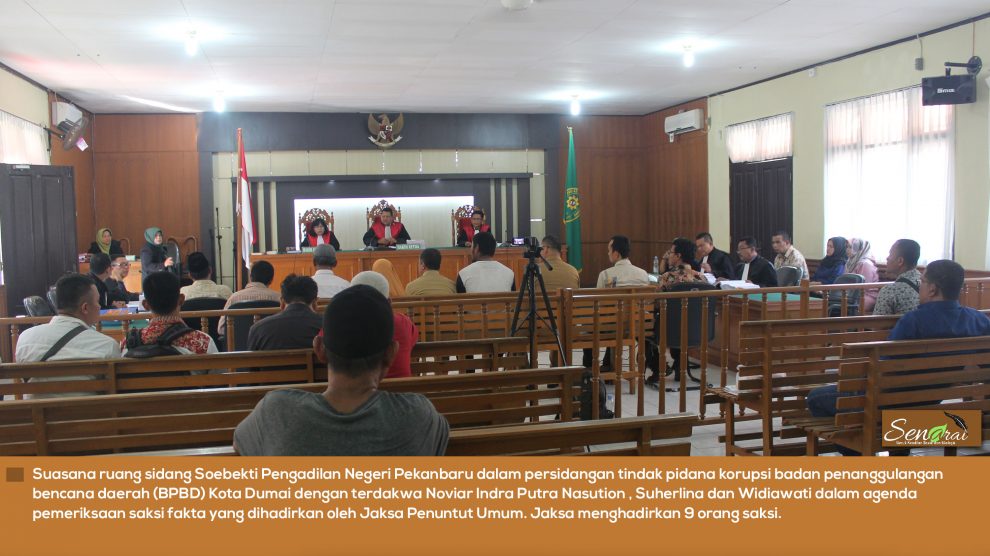 PN Pekanbaru, 23 Agustus 2018—majelis hakim buka perisdangan perkara dugaan korupsi pembangunan RTH Tunju Ajar dengan terdakwa Dwi Agus Sumarno, Yuliana dan Rinaldi Mugni. Agenda sidang kali ini mendengarkan pembelaan atau dari pihak terdakwa.