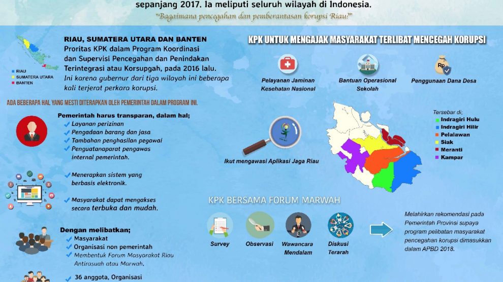Komisi Pemberantasan Korupsi (KPK) merangkum hasil kinerjanya sepanjang 2017 (klik). Ia meliputi seluruh wilayah di Indonesia. Bagaimana pencegahan dan pemberantasan korupsi Riau?