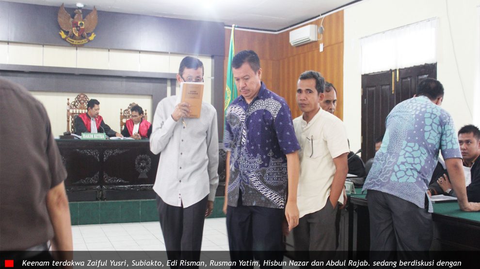 Pekanbaru, 19 April 2018. Setelah minggu lalu penuntut umum bacakan berkas tuntutannya, kali ini giliran tim kuasa hukum terdakwa Zaiful Yusri, Subiakto, Edi Erisman, Rusman Yatim, Hisbun Nazar dan Abdul Rajab, untuk bacakan berkas pledoi atau pembelaan.