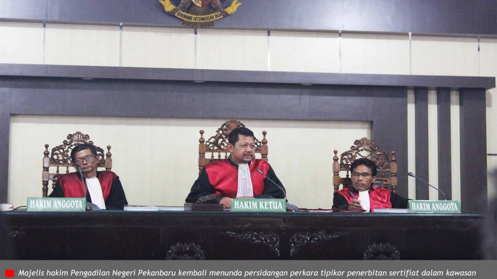 Pekanbaru, 5 April 2018. Majelis hakim Pengadilan Negeri Pekanbaru kembali menunda sidang perkara tipikor penerbitan sertifikat dalam kawasan Taman Nasional Tesso Nilo dengan terdakwa Zaiful Yusri, Hisbun Nazar, Rusman Yatim, Edi Erisman, Subiakto dan Abdul Rajab Nainggolan.