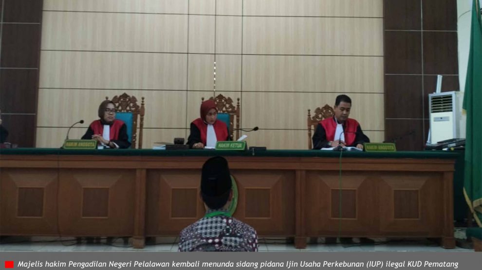PN Pelalawan, Senin 12 Maret 2018—majelis hakim kembali melanjutkan sidang perkara pidana perkebunan atas nama terdakwa KUD Pematang Sawit, setelah 5 hari sebelumnya ditunda karena penasihat hukum belum menyelesaikan berkas pembelaan.