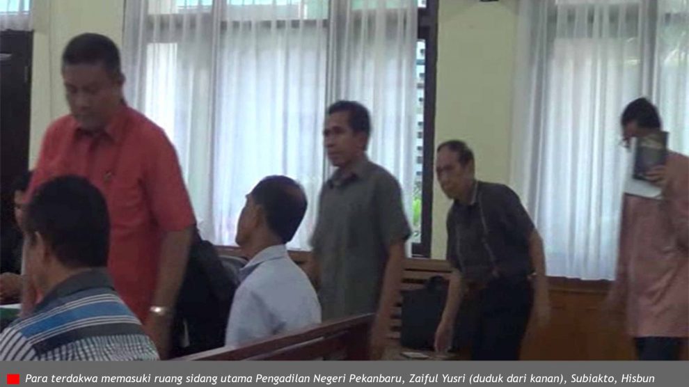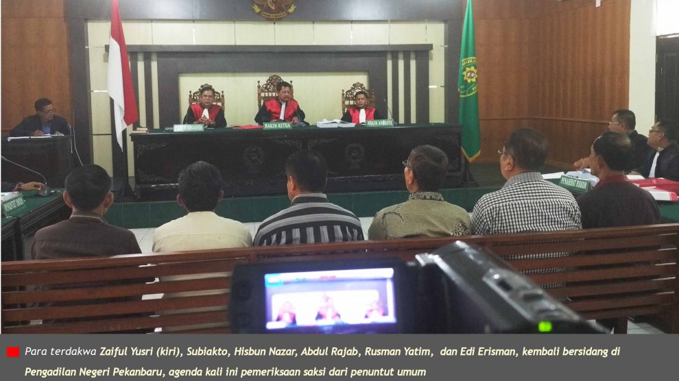 Video pemeriksaan saksi PN Pekanbaru, 28 Desember 2017—Pukul 16.25, hakim Bambang Miyanto membuka sidang tipikor kasus penerbitan sertifikat dalam kawasan Taman Nasional Tesso Nilo, dengan terdakwa Zaiful Yusri, Hisbun Nazar, Rusman Yatim, Edi Erisman, Abdul Rajab Nainggolan dan Subiakto...