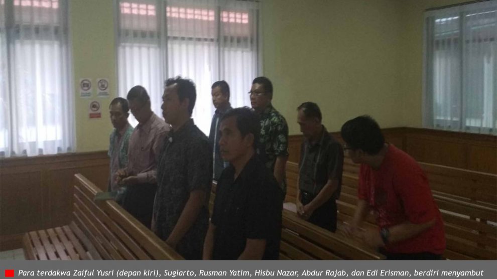 Video Senin, 8 Januari 2018. Setelah tertunda 6 jam, sidang kasus penerbitan sertifikat dalam kawasan Taman Nasional Tesso Nilo (TNTN) dengan terdakwa Zaiful Yusri, Sugiarto, Rusman Yatim, Hisbu Nazar, Abdur Rajab, dan Edi Erisman, dibuka oleh majelis hakim yang diketuai Bambang Miyanto...