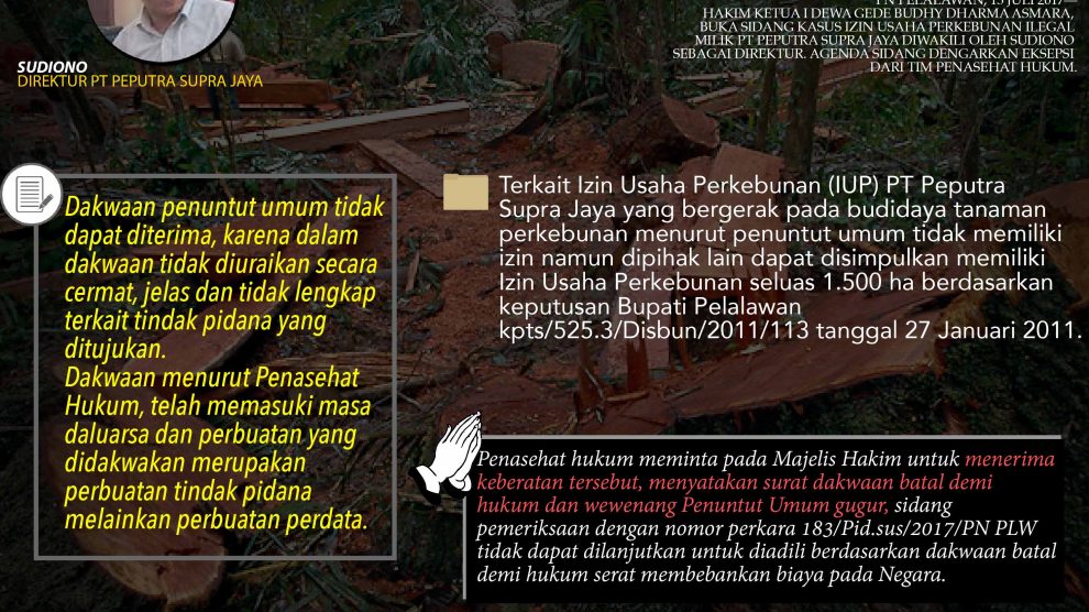 PN PELALAWAN, 13 Juli 2017—Hakim Ketua I Dewa Gede Budhy Dharma Asmara, buka sidang kasus izin Usaha Perkebunan illegal milik PT Peputra Supra Jaya diwakili oleh Sudiono sebagai direktur. Agenda sidang dengarkan eksepsi dari tim penasehat hukum. Tim pensehat hukum PT Peputra Supra Jaya...