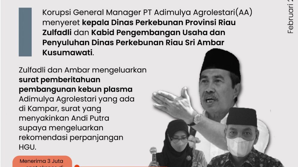 Pekanbaru, 14 Februari 2022–Korupsi yang dilakukan Kepala Dinas Perkebunan Propinsi Riau Zulfadli dan Sri Ambar Kusumawati Kabid Pengembangan Usaha dan Penyuluhan Dinas Perkebunan Riau dalam perkara Tindak Pidana Korupsi terdakwa Sudarso General Manager PT Adimulya Agrolestari (AA)...