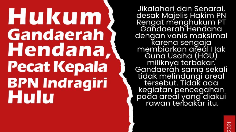 Pekanbaru, Selasa 9 November 2021—Jikalahari dan Senarai, desak Majelis Hakim PN Rengat menghukum PT Gandaerah Hendana dengan vonis maksimal karena sengaja membiarkan areal Hak Guna Usaha (HGU) miliknya terbakar. Gandaerah sama sekali tidak melindungi areal tersebut. Tidak ada kegiatan...