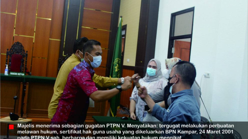 Sidang ke 12— Putusan PN Bangkinang, Rabu 21 Juli 2021—Ketua Majelis Hakim Riska Widiana bersama dua anggotanya Sofya Nisra dan Ferdi, membacakan putusan gugatan perbuatan melawan hukum antara PT Perkebunan Nusantara V dan 14 masyarakat adat Pantai Raja. Putusan setebal 116 halaman, itu...