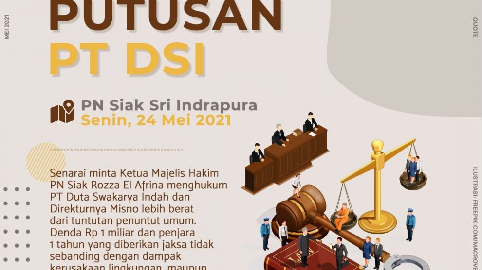 Pekanbaru, Sabtu, 22 Mei 2021—Senarai minta Ketua Majelis Hakim PN Siak Rozza El Afrina menghukum PT Duta Swakarya Indah dan Direkturnya Misno lebih berat dari tuntutan penuntut umum. Denda Rp 1 miliar dan penjara 1 tahun yang diberikan jaksa tidak sebanding dengan dampak kerusakaan...