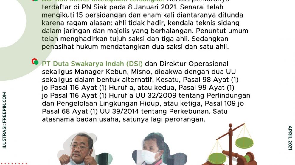 Pendahuluan PT Duta Swakarya Indah (DSI) dan Direktur Operasional sekaligus Manager Kebun, Misno, didakwa dengan dua UU sekaligus dalam bentuk alternatif. Kesatu, Pasal 98 Ayat (1) jo Pasal 116 Ayat (1) Huruf a, atau kedua, Pasal 99 Ayat (1) jo Pasal 116 Ayat (1) Huruf a UU 32/2009...