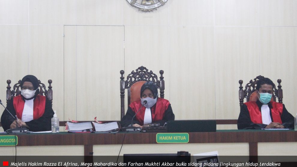 Sidang ke 15 : Pemeriksaan Terdakwa serta saksi dan ahli A de charge PN Siak, 6 April 2021—Majelis Hakim Rozza El Afrina, Pebrina Permata Sari dan Farhan Mukhti Akbar pimpin sidang pidana lingkungan hidup Terdakwa PT DSI atau Duta Swakarya Indah diwakili Dharlies dan Pengurus Misno Bin...