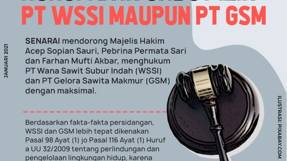 Pekanbaru, Senin 25 Januari 2021—Senarai mendorong Majelis Hakim Acep Sopian Sauri, Pebrina Permata Sari dan Farhan Mufti Akbar, menghukum PT Wana Sawit Subur Indah (WSSI) dan PT Gelora Sawita Makmur (GSM) dengan maksimal. Berdasarkan fakta-fakta persidangan, WSSI dan GSM lebih tepat...