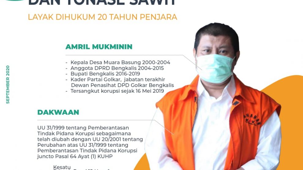 Pekanbaru, Selasa, 3 November 2020—Senarai meminta Majelis Hakim Lilin Herlina, Sarudi dan Poster Sitorus menghukum Amril Mukminin, pidana penjara 20 tahun dan denda Rp 1 miliar serta mencabut hak politiknya. Hukuman maksimal pantas diberikan pada Amril Mukminin, karena terbukti korupsi...