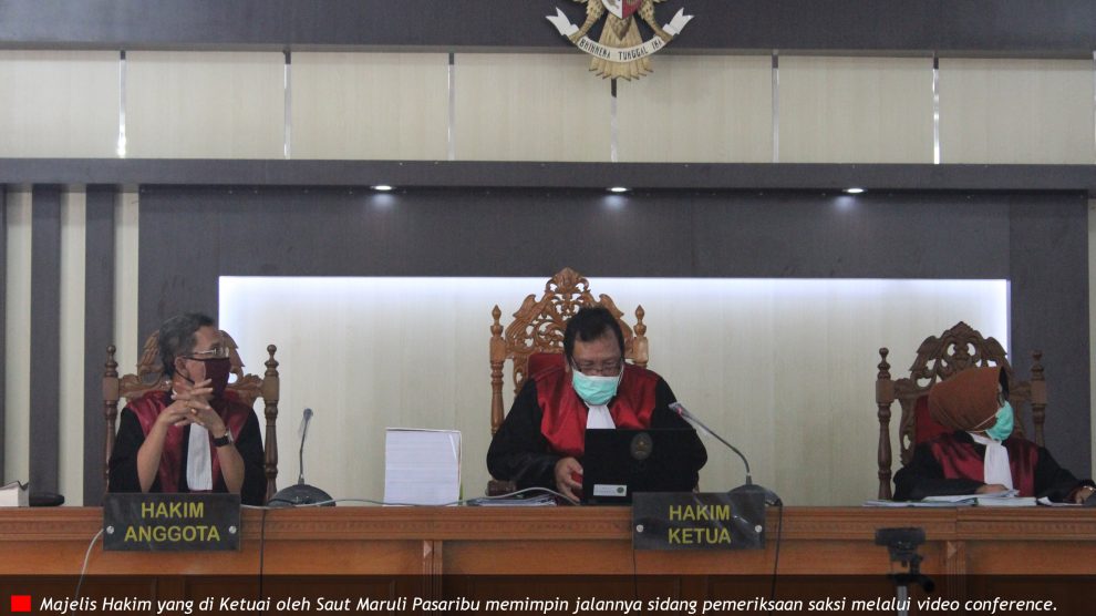 -Sidang ke 5: Agenda Putusan Sela PN Pelalawan, 5 Agustus 2020—Majelis Hakim Bambang Setyawan, Rahmat Hidayat Batubara dan Muhammad Ilham Mirza masuki ruang sidang cakra. Bambang majelis ketua ketuk palu pertanda sidang perkara 190/Pid.B/LH/2020/PN Plw dibuka dan terbuka untuk umum...