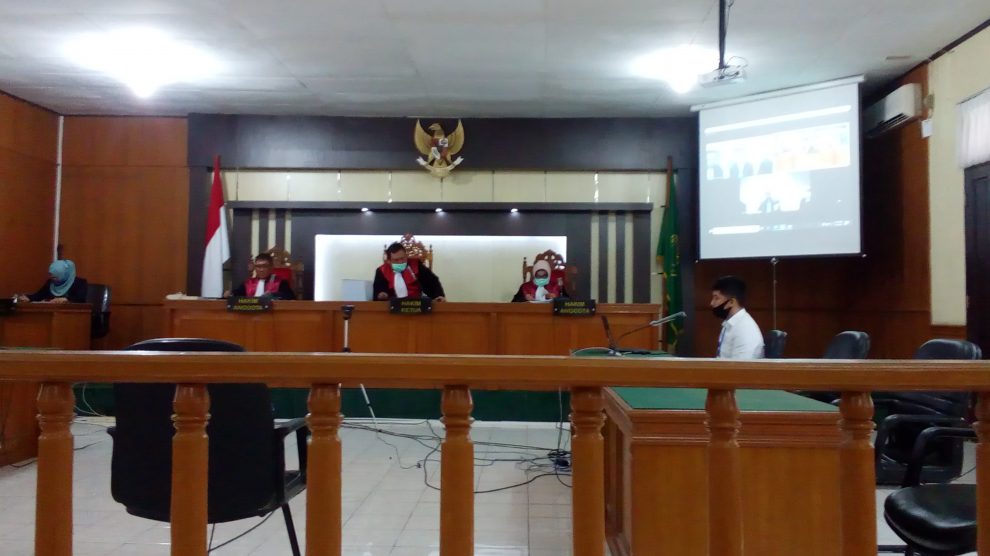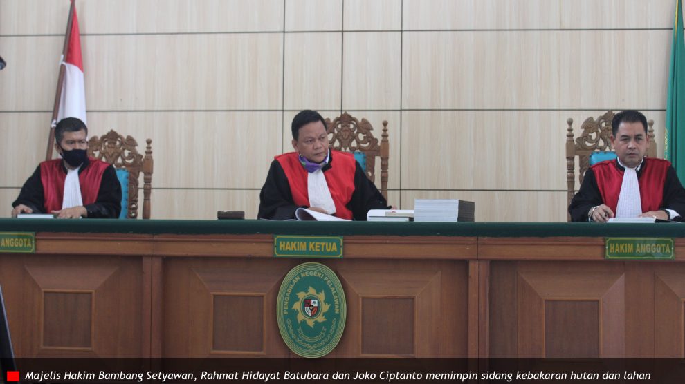 PN Pelalawan, Rabu 8 Juli 2020—Majelis Hakim Bambang Setyawan, Rahmat Hidayat Batubara dan Joko Ciptanto memimpin sidang kebakaran hutan dan lahan (Karhutla), terdakwa PT Adei Plantation and Industry, di Ruang Sidang Sari 2.