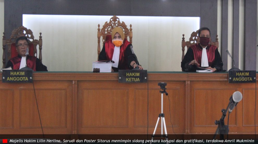 Sidang ke-1: Agenda Pembacaan Dakwaan PN Pekanbaru, Kamis 25 Juni 2020—Majelis Hakim Lilin Herlina, Sarudi dan Poster Sitorus memimpin sidang perkara korupsi dan gratifikasi, terdakwa Amril Mukminin di Ruang Sidang R Soebekti. Amril hadir dengan video conference dari Rutan KPK ditemani...