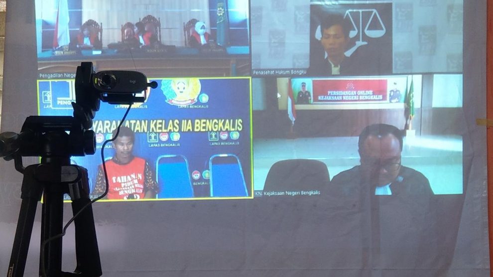 Sidang ke 6 – Agenda: Pemeriksaan Saksi PN Rengat, Senin 13 April 2020—Ketua Majelis Hakim Darma Indo Damanik bersama anggotanya Omori Rotama Sitorus dan Maharani Debora Manullang, melaksanakan sidang kelima perkara lingkungan hidup Kebakaran Hutan dan Lahan (Karhutla), terdakwa PT Tesso...