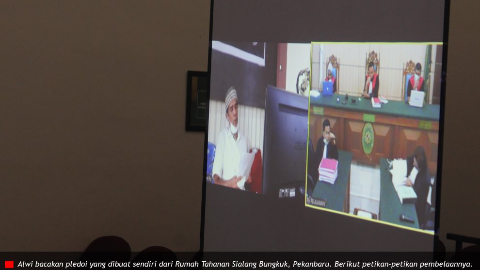 Sidang ke-17 Agenda: Pembacaan Pledoi/ Pembelaan dari Terdakwa (Alwi) PN Pelalawan, Selasa 14 April 2020—Ketua Majelis Hakim Bambang Setyawan bersama anggotanya Nur Rahmi dan Joko Ciptanto, gelar sidang pidana lingkungan hidup Kebakaran Hutan dan Lahan (Karhutla), terdakwa PT Sumber Sawit...
